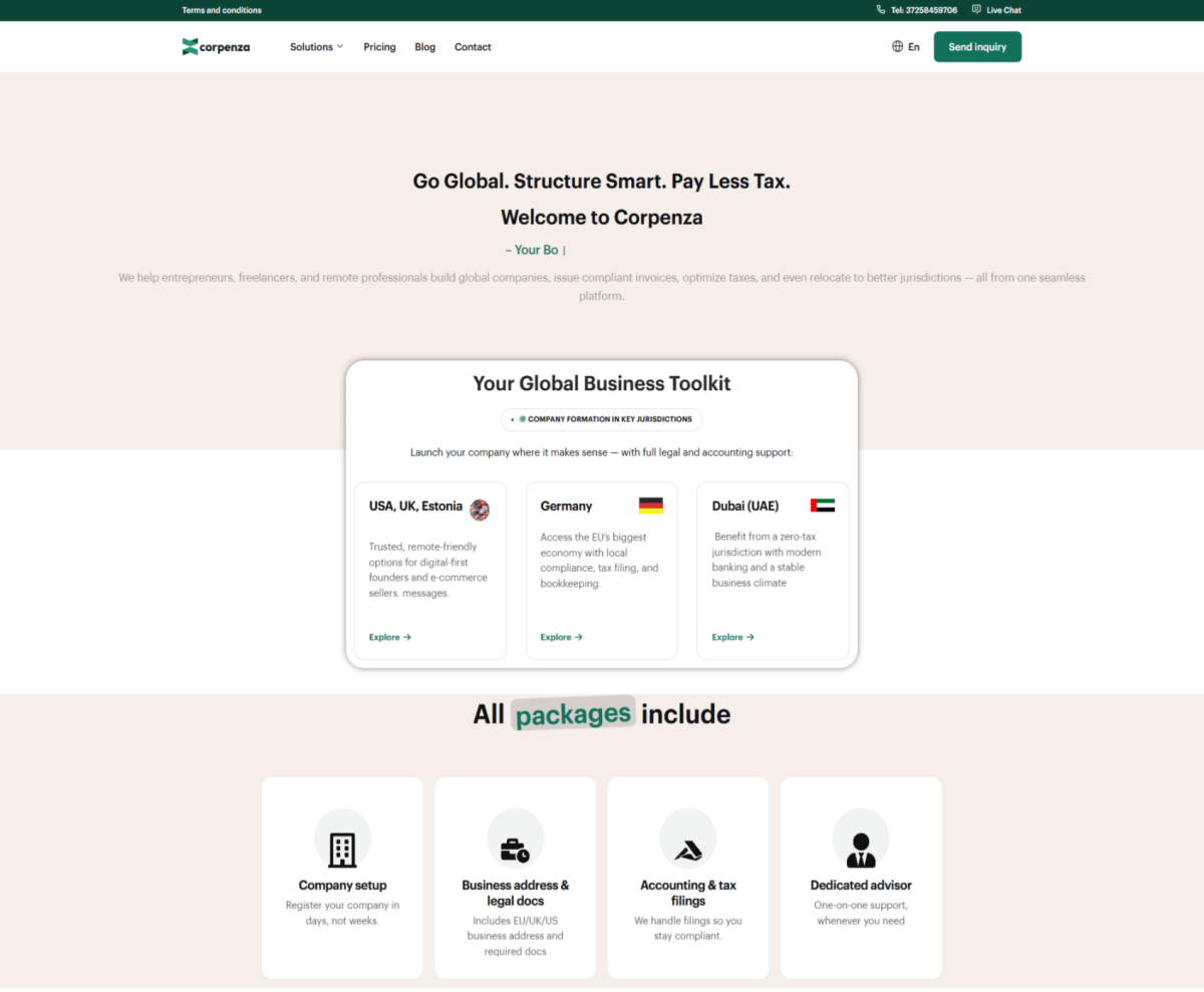 Corpenza için hazırladığım web sitesi, markanın global danışmanlık hizmetlerini modern ve güven verici bir tasarımla dijital ortama taşıyor. Site, uluslararası iş kurulumundan vergi ve hukuk danışmanlığına kadar geniş bir hizmet yelpazesini sade bir kullanıcı deneyimiyle sunuyor.